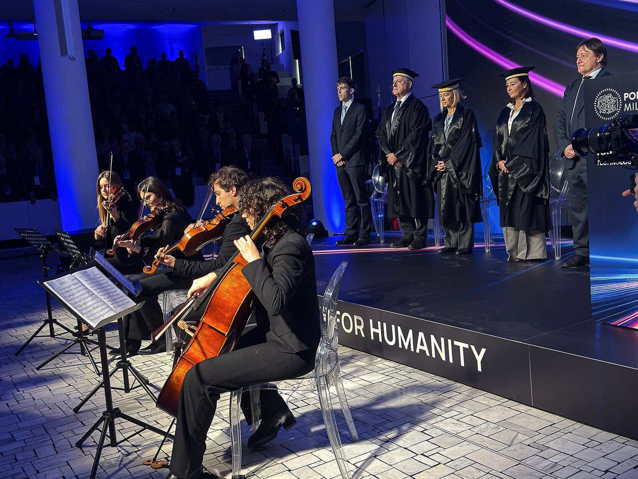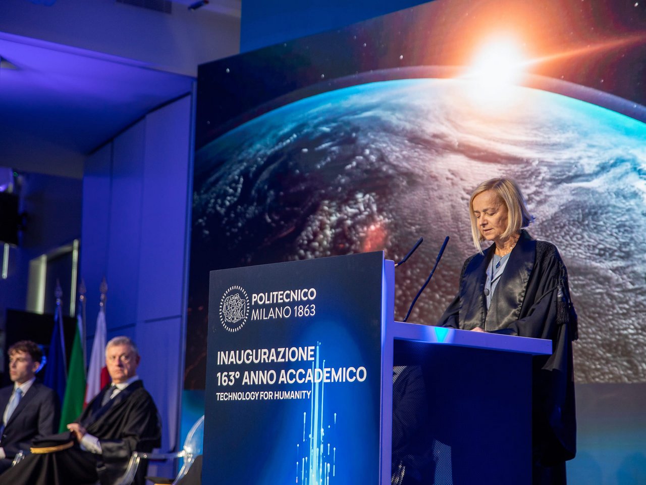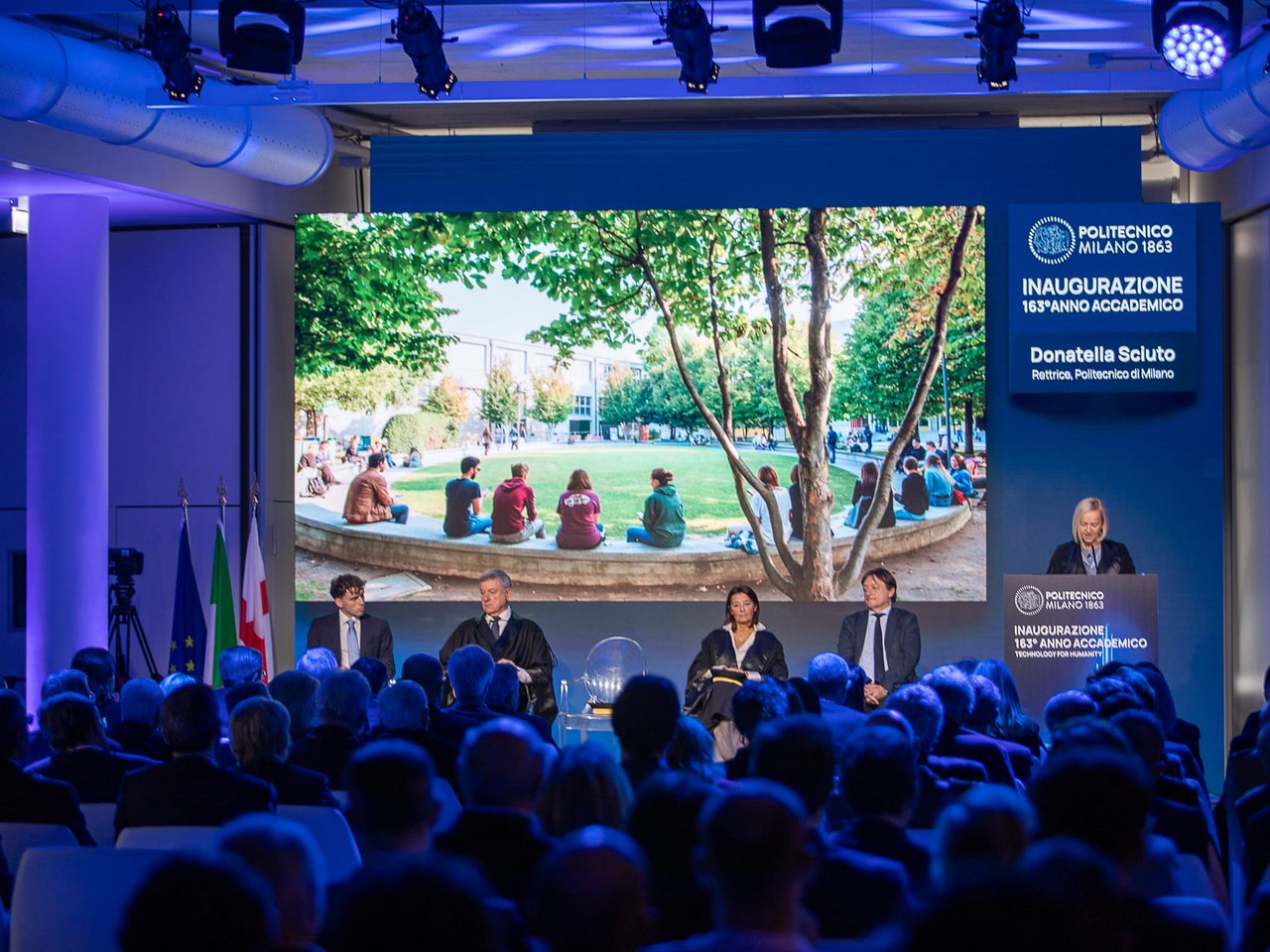 The speech held by Rector Donatella Sciuto was focused on the Politecnico’s role as an intermediary, a body with the ability to piece together the bigger picture; an institution that can turn change into something meaningful, through critical thinking and measured reflection on the role of technology.