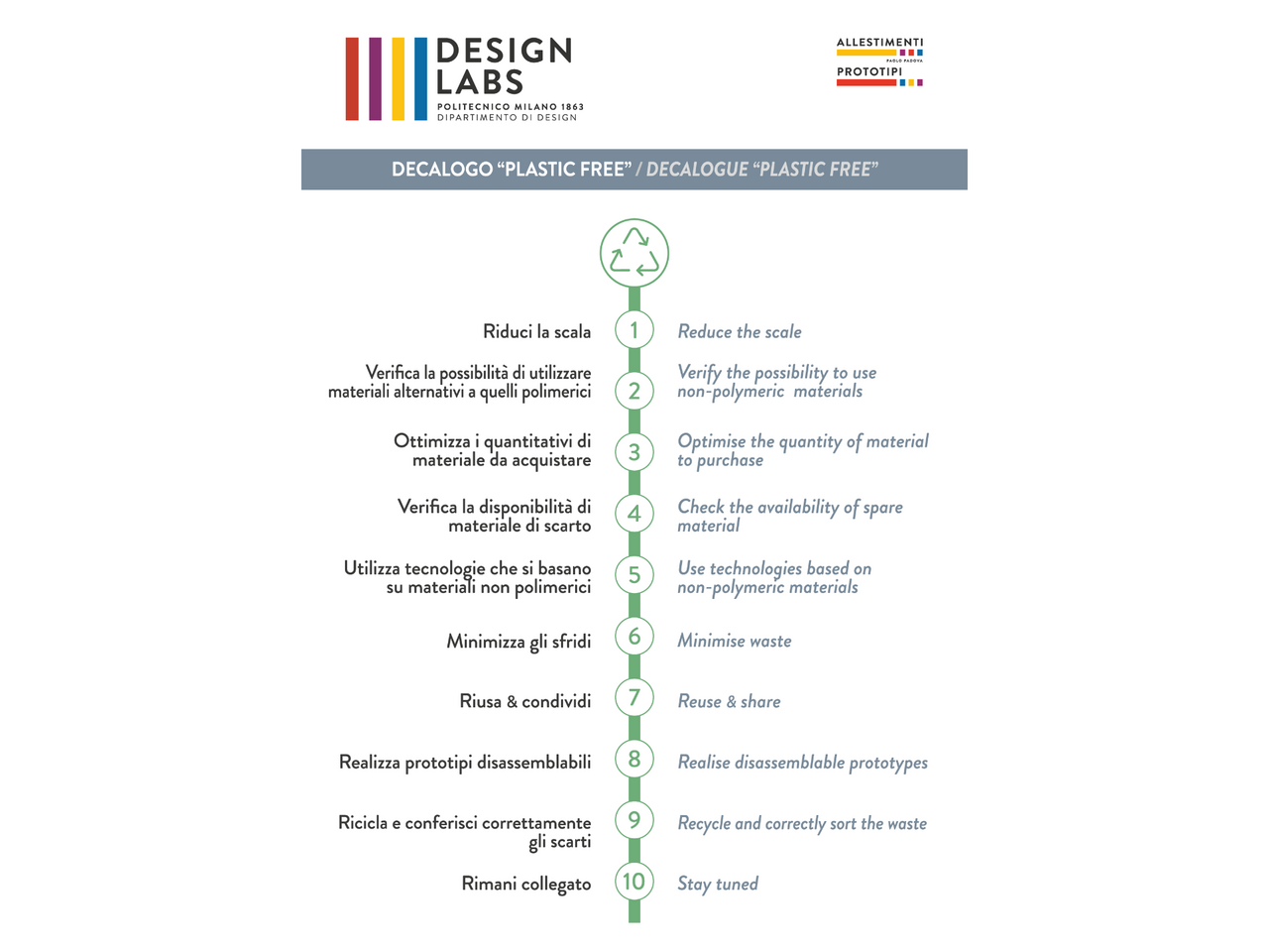Per promuovere e sensibilizzare una gestione più responsabile nella realizzazione dei prototipi il Dipartimento di Design ha sviluppato un Decalogo “Plastic Free” per promuovere pratiche di economia circolare. Il documento propone dieci principi operativi che guidano progettazione e produzione: dalla riduzione della scala dei prototipi e dalla preferenza per materiali a basso impatto ambientale, fino alla minimizzazione degli sfridi e alla realizzazione di prototipi disassemblabili.